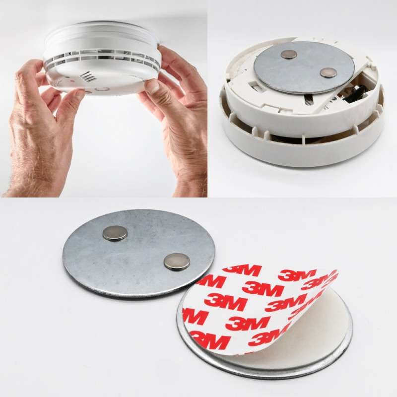 Ce système de fixation universelle est un assemblage de deux contreplaques métalliques adhésives et deux aimants néodymes. Une contreplaque vient se coller au détecteur tandis que la seconde se colle au mur. Les deux aimants entre les plaques assurent une fixation aimantée puissante ! Aucun assemblage à réaliser, aucun mur à percer, l'ensemble est prêt à l'emploi tout de suite. Vendu en lot de 2 pièces minimum, ce support pour détecteur de fumée propose des tarifs dégressifs très avantageux pour équiper vos locaux professionnels en nombre. Les contreplaques mesurent 70 millimètre de diamètre et les aimants mesurent 10 millimètres de diamètre pour 1 millimètre d'épaisseur. L'adhésif 3M utilisé sur les contreplaques est un adhésif puissant qui colle sans difficulté sur toute surface lisse.
